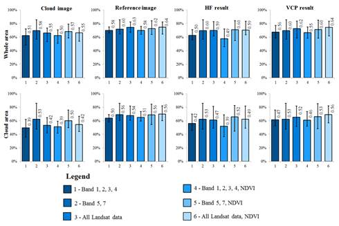 The classification results were assessed further to understand the principle how each algorithm performed in the cloud contaminated area. The assumption here is that the haze contaminated bands provided added variability that causes these areas more difficult to be classified. Evaluating these results therefore offers a more specific viewpoint of classification performance than those in the whole area. Not surprisingly, the results from the cloud area corroborate the results in the whole area: the HF and VCP performed better than the results for cloud image. The overall accuracies in cloud area for the HF and VCP (52.0%-69.0%) were markedly higher than those for the cloud image (49.4%-62.3%), with some added variability indicated by the increase in the error bars for all feature combinations.