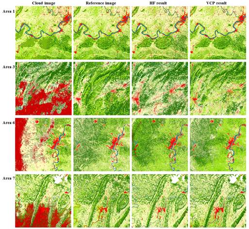 On the other hand, after haze removal based on HF and VCP, the land cover types were correctly classified in the same area. The classified results after VCP haze removal were similar to the results of reference image, although there still existed some differences between the results of reference image and VCP. The different acquisition time of the reference image may be the major reason for this discrepancy. figure 6 also reveals that the HF did not achieve useable map results compared to VCP, but it still improved the accuracy of classification.