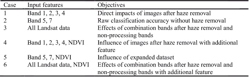 To evaluate the impact of haze removal on classification (both the addition of transformed features and reduction of inputs), a series of experiments were devised in which different combinations of bands were tested as input to ML classifier. As being showed in Table 3, the first experiment used visible and near-infrared bands as inputs; this experiment was treated as the direct effects of images on classification after haze removal. In the second experiment, near-infrared and mid-infrared bands were used as inputs to figure out classification accuracy with the reduction of band1,2,3,4, which caused to lower image quality. In the third experiment, the impacts of combinative bands after haze removal and bands without processing were tested by using all Landsat bands. During the following sets of experiments, the Landsat data (with or without haze removal) were augmented with some additional features (normalized difference vegetation index (NDVI)) to produce an expanded dataset for each study area (cases 4-6).