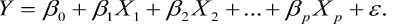 (1)Em que Y é a variável dependente ou a variável de interesse; X1, X2,...,Xp são as variáveis independentes ou explicativas; β0, β1, β2,..., βp são os coeficientes da regressão ou regressores que representam o peso que cada variável explicativa têm na formação do valor Y, geralmente estimados pelo Método dos Mínimos Quadrados, no qual se buscam aqueles que proporcionam a menor soma dos quadrados dos resíduos.