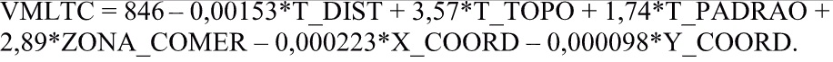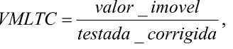 A metodologia não foi aplicada com base nos valores reais de compra e venda dos imóveis, mas em relação ao Valor do Metro Linear da Testada Corrigida (VMLTC), que é dado pelas Equações 4 e 5.