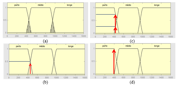 Observando os intervalos definidos para a variável T_DIST na Figura 2, é possível perceber a principal característica da lógica fuzzy, o princípio da nebulosidade. Na Figura 2 (a), destacam-se as distâncias entre 400 e 500 m, que podem ser entendidas tanto como perto, quanto como médio, com distintos graus de pertinência, e as distâncias entre 900 e 1000 m, que podem ser entendidas tanto como médio, quanto como longe. Na Figura 2 (b), a seta indica que, para as duas funções, tem-se a mesma pertinência, 0,5. Na Figura 2 (c), nota-se que, para um mesmo valor da variável T_DIST, atribui-se a pertinência 0,75 para perto e 0,25 para médio. A Figura 2 (d) apresenta as pertinências 1 para perto e 0 para médio.