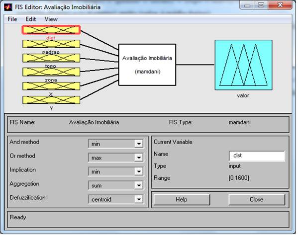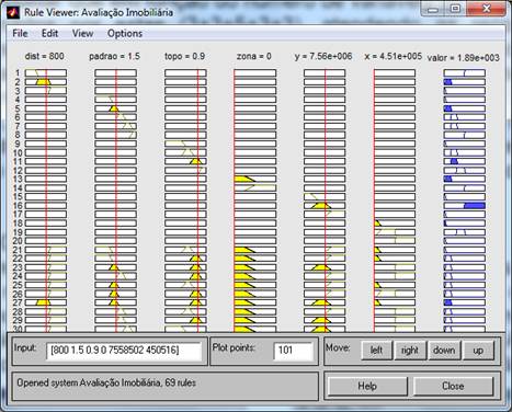 Foram inferidos os valores dos 71 pontos da amostra e dos 6 pontos de verificação. A Figura 4 mostra um exemplo em que são dados os valores das variáveis de entrada e o sistema fornece a saída em valor.