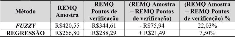 (6)Os REMQs obtidos foram R$ 420,55 para a amostra de 71 pontos e R$ 344,61 para os 6 pontos de verificação.