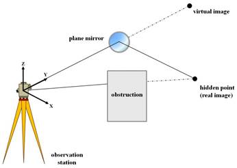 The purpose of this study is the determination of hidden point coordinates, whose observation is impossible by the presence of obstruction in direct line of sight between the observer and the point of interest. The proposed solution consist by including a new element in the system, a plane mirror which will allow the visualization of the hidden point indirectly, by the virtual image observation (Figure 1). Thus, if the position and attitude of the mirror is determined and if it is possible to perform measurements in point considering the mirror reflection characteristics, then the system geometry is determined and the position of the hidden point is performed.