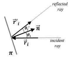 . Finally, the line of the reflected ray (ri’) is defined by containing as the origin the intersection point of the incident ray on the mirror surface and takes the direction of the reflected ray, such as: