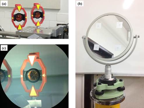 In performing the tests, the total station was placed in a configuration that allows the viewing of marks recorded on the surface of the mirror (Figure 3b) and the hidden points directly and indirectly (Figure 3c) by the mirror reflection. The environmental conditions were also monitored and used to correct the distances obtained electronically.