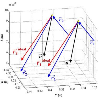 In Figure 4 it is possible to identify the reflected ray calculated by the model is different compared to the ideal reflected ray, obtained by the reference coordinates of the points observed directly. It was also found that this effect is similar for all points measured at each mirror attitude. Then, when the mirror position is changed, therefore the distortion in the point coordinates is changed. This fact supports the assumption that mirror the inherent characteristics are conditions for systematic effects observed. In this reasoning, two hypotheses were formulated and tested for the possible cause of distortion of rays: