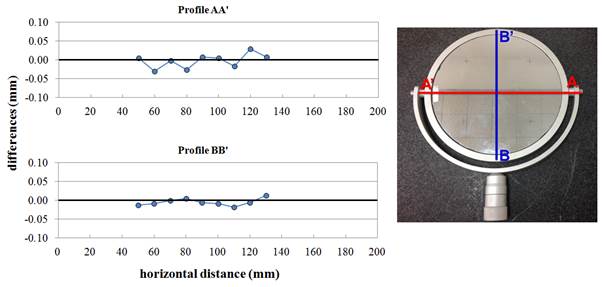 In order to investigate the flatness of the mirror and thereby verify the first hypothesis, mirror surface profiles were developed using an electronic level based on body suspended which with associated precision is 0.2 arc seconds. The feature of this level is to provide the relative slope between the sensors at each end of its contact surface. The profiles were generated for horizontal and vertical directions of the central mirror region (Figure 5). In the profiles indicate that the differences in relation to a reference plane, not exceeding 0.05 mm of magnitude which is a negligible value when compared to the precision of the observations of a higher order.