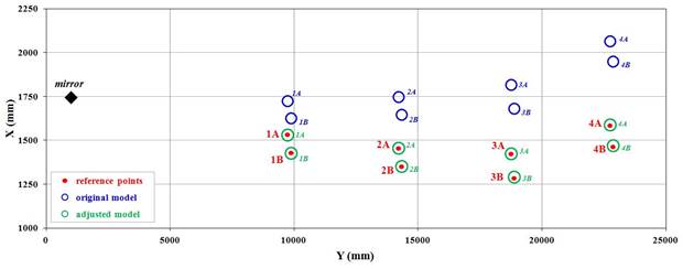 In Figure 6, the results from the original model are displayed in blue while the results of the adjusted model display in green and the red points correspond to the actual position of the points that have been calculated directly and adopted as reference values. The first finding as mentioned earlier is that the coordinates of points calculated by the original model has errors in their absolute positions of greater magnitude than the adjusted model. Such errors are of order centimeter and are directly proportional to the distance between the object and the mirror as seen in Figure 6, since the effect of the angular uncertainty is amplified as the point departs from the mirror position. In the second group from the adjusted model, the results showed significant improvements in presenting to the millimeter order in absolute position. Table 1 displays the values found.