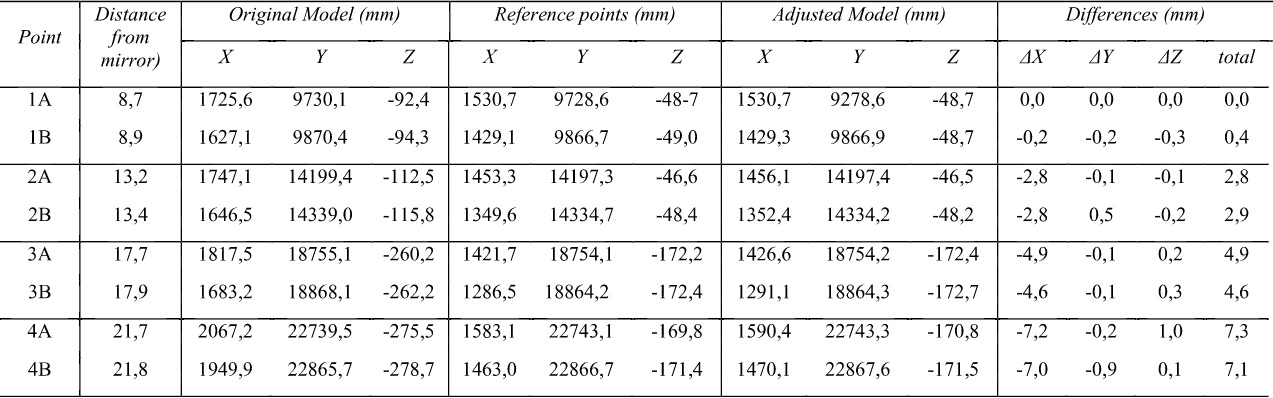 The point 1A was adopted as corrections to be as close to the mirror so its position was fixed in the solution, resulting in the absence of errors in its indirect determination by the adjusted model. Points that are closest to the mirror and simultaneously away from the hidden point should be used as references in surveys. The other differences presented millimeter tenths of values for the components Y and Z. The X component absorbed large portion of the existing error in the solution. After correcting model angular problems, the main source of error in the model are the distances measured, positioned in the X direction according to the composition of the reference system adopted. Note also that the coordinate differences observed are greater when the point moves away from the point 1A. In addition, similar distances contain errors in the absolute position also similar and with the same magnitude hence a residue as result of distance between the mirror and object.