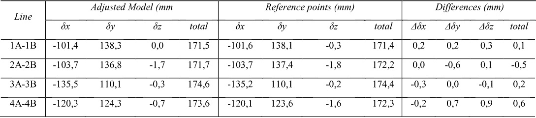 Differences in submillimeter order indicated in Table 2 show that the attitude and dimensions between the points calculated by the proposed model are preserved, without deformation or scale changes. However, the relative position of submillimeter order is ensured only between points having similar distances, which in turn imply the minimization of the error residues shown in Table 1.