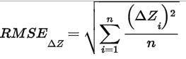 Para a avaliação dos resultados foram adotados critérios qualitativos e quantitativos. O critério qualitativo se pautou na interpretação visual dos resultados por parte de um operador humano, que observou a suavidade do modelo digital de terreno gerado e o seu poder de descrição do relevo. Já para a análise quantitativa foram calculados os seguintes indicadores numéricos: Média (Equação 4), Desvio-Padrão (Equação 5) e Raiz Quadrada do Erro Quadrático Médio - RMSE, sigla em inglês (Equação 6), por meio das discrepâncias altimétricas (ΔZ). As discrepâncias altimétricas foram obtidas pela diferença entre os pontos de referência, colhidos manualmente na nuvem de pontos LASER (com o auxílio da imagem de intensidade), e os correspondentes no MDT final. Os pontos de referência foram selecionados no meio das quadras, ou seja, afastados das vias onde foram retiradas as amostras iniciais.