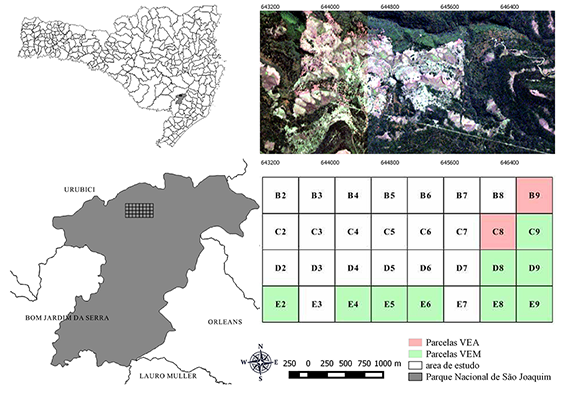 Após a etapa de pré-processamento, definiram-se as classes e procedeu-se à coleta de amostras. As classes encontradas na área de estudo foram: vegetação em estádio avançado (VEA), vegetação em estádio médio (VEM), vegetação em estádio inicial (VEI), banhado de altitude e campo. A seleção das amostras baseou-se em trabalhos em campo realizados por Faxina (2014) e na fotointerpretação de ortoimagens com resolução espacial de 0,39 m, oriundas do levantamento aerofotogramétrico de Santa Catarina (Engemap 2012). Foi gerado um arquivo de treinamento e outro arquivo com as amostras de validação, este não contemplando pixels utilizados no treinamento.