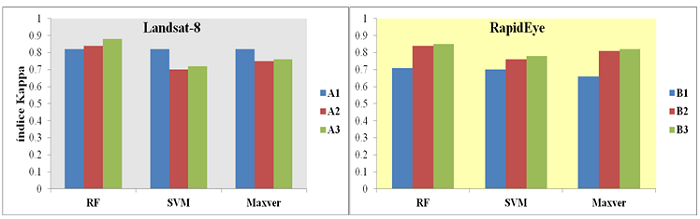 Para os grupos A2 e B2, compostos apenas pelas componentes texturais das bandas espectrais, o algoritmo RF obteve melhor desempenho. Percebeu-se que as informações texturais aumentaram a acurácia da classificação nos classificadores SVM e Maxver apenas para a imagem RapidEye. Isso pode estar atrelado ao fato de que imagens RapidEye têm maior resolução espacial, e as medidas texturais suavizaram as sombras da imagem e os ruídos intraclasse. Nos grupos de informações A3 e B3, o classificador RF novamente se destacou em relação aos demais, obtendo acurácia máxima na imagem Landsat-8. Novamente, para os classificadores SVM e Maxver, apenas nas imagens RapidEye houve aumento da acurácia em comparação ao se utilizar somente as bandas espectrais puras.