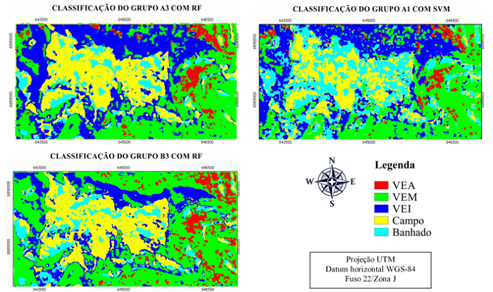 Comparando os três estádios sucessionais individualmente, nenhum algoritmo conseguiu melhor acurácia para todas as classes nos diferentes grupos de informações. Os grupos de variáveis A3 e B3 associados ao algoritmo RF produziram os melhores resultados para as classes VEA e VEM. Na classe VEI, os resultados variaram conforme a imagem. Para a imagem Landsat-8, o melhor desempenho foi alcançado com o algoritmo SVM associado ao grupo A1, ao passo que, na imagem RapidEye, o algoritmo Maxver associado aos grupos B2 e B3 teve melhor desempenho.
