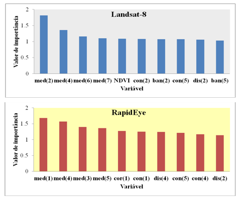 A medida de importância da variável fornecida pelo RF teve significativa contribuição para fornecer uma visão de cada variável utilizada na classificação das imagens Landsat-8 e RapidEye. Para ambas as imagens, destacaram-se as métricas texturais GLCM: média, dissimilaridade e contraste.