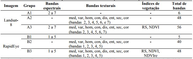 Para cada imagem, foram utilizados três grupos de informações distintos, definidos como A1, A2 e A3 nas imagens Landsat-8; e B1, B2 e B3 nas imagens RapidEye (Tabela 1). No primeiro grupo, utilizaram-se somente as bandas espectrais puras de cada sensor, com exceção da banda ultra-azul do Landsat-8, descartada por apresentar ruído. O segundo grupo foi composto apenas pelas métricas texturais derivadas das bandas espectrais. Dentre as métricas texturais disponíveis, optou-se por aquelas obtidas a partir da matriz de co-ocorrência dos níveis de cinza (grey levels co-ocurrence matrix - GLCM), proposta por Haralick, Shanmugam e Dinstein (1973). Em seu estudo inicial, Haralick, Shanmugam e Dinstein (1973) definiram 14 características texturais que foram derivadas de matrizes de co-ocorrência. Como elas são correlacionadas uma com a outra, seis delas são consideradas as mais relevantes para a análise de imagens em Sensoriamento Remoto: segundo momento angular, contraste, variância, homogeneidade, variância, correlação, entropia (Lu et al. 2014). Além destas seis métricas citadas, neste estudo também se utilizou a dissimilaridade e a média textural.