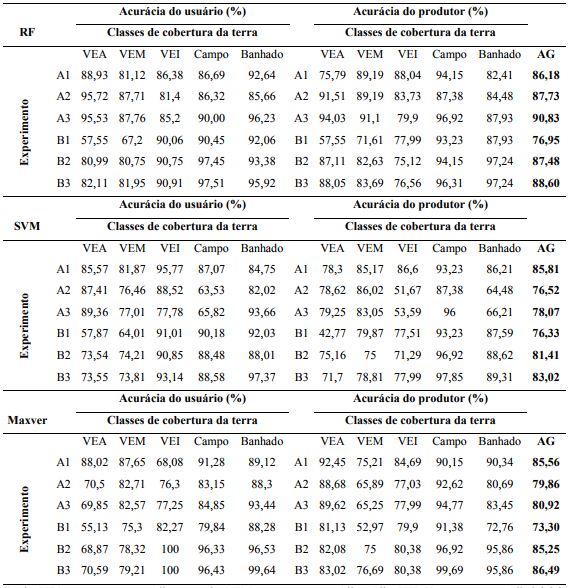 Quanto aos estádios sucessionais da vegetação, as três classes alcançaram acurácia do usuário e do produtor superiores a 50% nos algoritmos RF e SVM. O RF teve melhor desempenho para discriminar as classes VEA e VEM, enquanto o Maxver teve melhor desempenho na classificação da VEI.