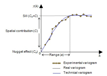 Similar to the statistical method, there are 3 (three) types of variograms: the observed, or experimental, the real, and the theoretical variogram. In practice, only the experimental variogram is known and the theoretical variogram serves as reference to estimate the real variogram. Figure 1 illustrates the three types of variograms (Guerra, 1988).