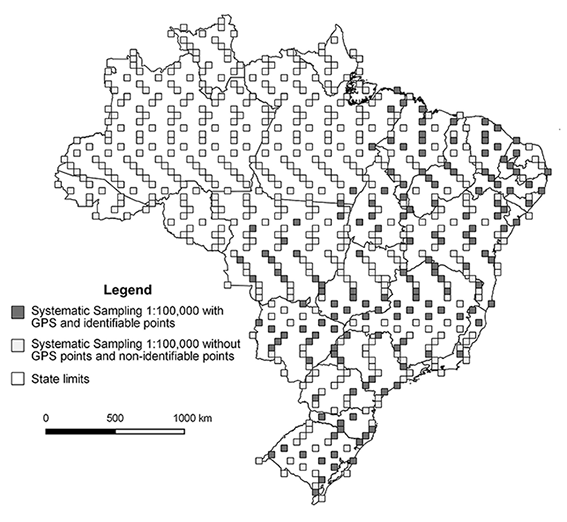 The goal was to have one point noted per 1:250000 sheet. The inspection method chosen was systematic random sampling. The grid utilized was articulations of systematic mapping, at scale of 1:100000. Each cell delineated an inspection area, similar to search windows, where field points (GPS) could be identified and compared with their counterparts, on the referred cartographic base, as shown in Figure 3.