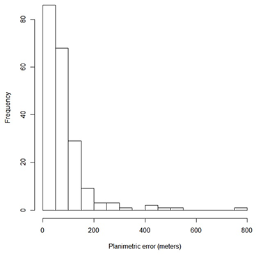 The observed values were used to calculate the percentage of planimetric errors that were above Class A of PEC for the 1:250000 scale. Table 4 summarizes the quantities and percentages observed.