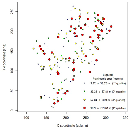 Systematic random sampling technique proved to be efficient, showing a spatial distribution suitable for the coverage area of the evaluated dataset. In practice, factors such as difficult accessibility of certain regions, or the presence of clouds in the images analyzed, among others, hampered the collecting and the identifying of control points of the projects. Thus, a larger search window would facilitate the collection, selection and identification of field points for measuring the planimetric error and performing the geostatistical analysis.