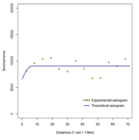 The behavior of the variogram, as show in Figure 6, indicates the existence of regionalizations in different areas, but with similar spatial dependence observed by the isotropy of the phenomenon.