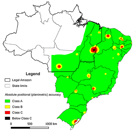 The quality map shows the concentration of regions with high planimetric error, close to the demarcation of Legal Amazon, indicating possible systematic errors, according to the BC250 producer team. These are places of difficult access, such as the Pantanal Mato-grossense, or areas with excess of clouds, which caused difficulties in collecting and identifying points to orthorectificate the orbital images of the project.