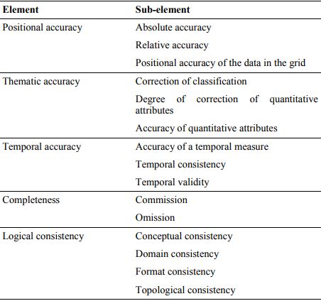 ISO 19157:2013 standard addresses 6 (six) elements of spatial data quality: positional accuracy, thematic accuracy, temporal accuracy, completeness, logic consistency, usability and their respective sub-elements, as shown in Table 1