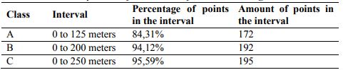 For measuring the absolute positional accuracy of dataset, Brazil' Continual Cartographic Base, at scale of 1:250000 - BC250, easily identifiable features on the terrain such as: roads, junction of roads, level crossings and bridges were considered. The level of compliance of the absolute positional accuracy planimetric of the dataset, in the scale of 1:250000, was based in PEC, as show Table 2. For a cartographic product to be considered Class A, it must have 90% of the planimetric error less than 125 m (0.5 mm of scale). The control points for the points collected in the field are from other projects of IBGE`s Coordination of Cartography (CCAR) and were not used for the production of assessment spatial dataset.