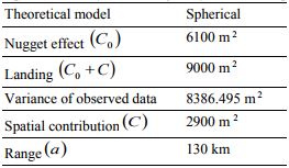 The main parameters of a variogram are: the range (a), which is the distance from which the samples become independent, that is, the spread between two values observed are aleatory and without spatial correlation, this is the principal of Classical Statistics; the nugget effect (C0), which is the discontinuity at the origin of the variogram, being a particular correlation between samples, where γ(0)=0 and γ(e)=Cov(0) (nugget effect), e being the shortest distance between samples. This can be attributed to measurement errors, or to the fact that the data has not been collected at intervals small enough to show the underlying spatial behavior of the phenomenon under study (Landim, 1998; Vieira, 2000).