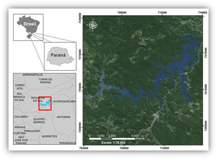 Nesse contexto, o objetivo desta pesquisa foi analisar os métodos de posicionamento e os parâmetros definidores da qualidade do posicionamento da embarcação em levantamento batimétrico realizado no Reservatório de Capivari-Cachoeira (Figura 1), que está localizado na Rodovia BR-116 (trecho Curitiba: São Paulo), entre os municípios de Campina Grande do Sul e Bocaiúva do Sul, com coordenadas geográficas situadas a 25°07’ de Latitude Sul e 48°44’ de Longitude Oeste, a 50 km de Curitiba (Carvalho, 2009; COPEL, 2011). Possui uma área de aproximadamente 13 Km², volume de 179.000.000 m³; e profundidade média de 14 metros e máxima de 43 metros (Carvalho, 2009; IAP, 2010; FCMC, 2014).