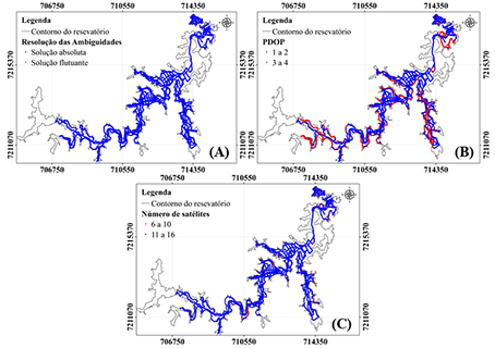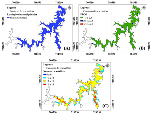 Para estimar a resolução das ambiguidades, o número de satélites e PDOP; foi utilizado o interpolador IDW, o qual melhor representou as características do reservatório. Pois devido à heterogeneidade na dispersão dos pontos, os outros métodos generalizaram as informações, representando de forma inadequada à realidade dessas variáveis ao longo da área de estudo. A resolução das ambiguidades (Figura 11A) apresentou uma solução absoluta para todo o reservatório. O número de satélites observados foi de 6 a 18, com o predomínio de 13 a 15 satélites observados na maior parte do levantamento (Figura 11C). O intervalo de PDOP (Figura 11B) ficou entre 1,3 e 4,8, com predominância de valores mais baixos (1,3 a 2,5), e os valores mais elevados foram identificados nas bordas do reservatório. Segundo Krueger (2011), para o método cinemático os valores obtidos neste trabalho estão dentro da classificação de um bom levantamento, ou seja, apresentam PDOP menor que 5.