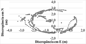 As discrepâncias nas componentes E e N, apresentaram valores médios de -1,53 e 1,29 metros, respectivamente. Com variação entre -3,30 e 1,50 metros para a componente E; e de -1,17 a 2,89 metros para N (Figura 12).