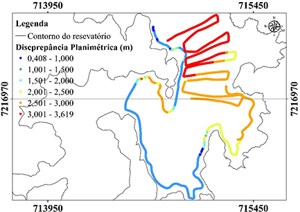A partir desses valores se obteve a discrepância planimétrica com intervalo entre 0,41 e 3,62 metros. Com o uso do MPRC como referência esta operação envolveu 4.318 observações, a qual gerou resultados na ordem do metro, como observado na Figura 13.