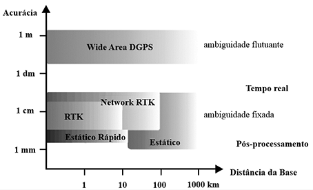 O posicionamento através do GPS diz respeito à determinação da posição de objetos em relação a um referencial e época específicos, podendo ser realizado a partir de diferentes técnicas e observáveis, as quais fornecem níveis de precisão que variam desde algumas dezenas de metros até poucos milímetros (Figura 2). Normalmente, é efetuado a partir da fase de batimento da onda portadora e/ou da pseudodistância. Devido à precisão da medida da fase da onda portadora ser da ordem de milímetros, ela é a observável indispensável na obtenção de posicionamentos que requerem melhor precisão. A pseudodistância é mais utilizada em posicionamentos com precisão de ordem métrica, pois utiliza o código para determinar a distância entre o satélite e o receptor. Desta forma, segundo Krueger (1996) e Monico (2008), os métodos de posicionamento podem ser classificados em: