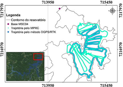 Visando uma análise da precisão e acurácia dos métodos de posicionamento planimétrico empregados na embarcação (DGPS/RTK, MPRC e PPP, no sistema de referência SIRGAS 2000 época 2000.4) foram selecionados os dados levantados no dia 01 de dezembro de 2012. A Figura 3 apresenta a trajetória descrita pela embarcação neste dia, bem como a localização da estação base (MSC04) para o posicionamento relativo cinemático, DGPS/RTK e o contorno do reservatório. Desta forma foi necessário efetuar uma nova seleção da trajetória da embarcação obtida pelo DGPS/RTK, em que foram empregadas as informações contidas na mensagem NMEA-0183 para o levantamento (Figura 3). Estas informações devem representar praticamente a mesma trajetória da embarcação obtida a partir do processamento dos dados coletados pelo método relativo cinemático.