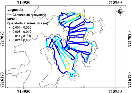 Os dados gravados nas memórias dos receptores instalados nas estações de referência (marco MSC04) e móvel (embarcação), no dia 01 de dezembro de 2012, foram processados pelo software LGO. As coordenadas planimétricas que compõem esta trajetória advêm de uma solução de 100% dos inteiros das ambiguidades. Em relação à qualidade do posicionamento planimétrico do método de Posicionamento Relativo Cinemático, apresentada no LGO os valores mínimo e máximo foram de 0,001 e 0,050 metros, respectivamente. Com uma qualidade entre 0,004 metros e 0,009 metros em 10.772 pontos dos 17.047 que compõem a trajetória processada no levantamento (Figura 4).
