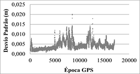 A Figura 5 apresenta os desvios padrão obtidos para as coordenadas planimétricas, ou seja, os valores encontrados indicam a precisão relativa da trajetória descrita pela embarcação após o processamento. Constata-se que o resultado está dentro do esperado para este método de posicionamento, visto que o IBGE preconiza uma precisão de 1 a 10 ppm. Sendo esta trajetória descrita, tomada como referência para comparação entre aquelas advindas do PPP e do DGPS/RTK.