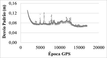 Portanto, removendo os pontos referentes aos primeiros 30 minutos é possível verificar que o desvio padrão se encontra entre os valores mínimo e máximo de 0,06 metros e 0,13 metros, respectivamente (Figura 6). Neste caso a imprecisão da trajetória da embarcação seria inferior a 13 cm, sendo superior àquela obtida com o MPRC. Pelo exposto anteriormente quando o usuário desejar empregar o PPP é conveniente que seja efetuada uma inicialização com a embarcação atracada ou docada de aproximadamente 30 minutos.