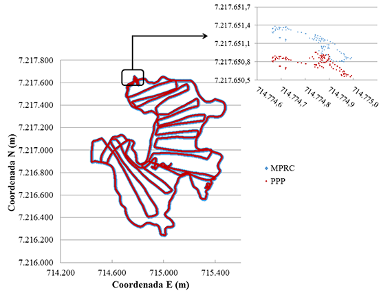 A Figura 7 apresenta as trajetórias descritas pela embarcação obtidas com base nos métodos MPRC e PPP, com uma discrepância máxima na componente N de aproximadamente 50 cm e 37 cm na componente E.