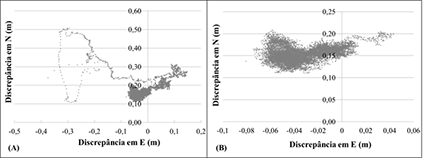 Visando detalhar mais as análises, os 30 minutos iniciais foram excluídos das trajetórias descritas e recalculando as diferenças planimétricas entre estas trajetórias verifica-se que elas se encontram entre -0,080 e 0,109 metros na direção E, e entre 0,043 e 0,208 metros na direção N (Figura 8B). Desta forma, se respeitada à inicialização de aproximadamente 30 minutos, pode-se dizer que a acurácia do método PPP deverá ser inferior a cerca de 25 cm, para este caso.