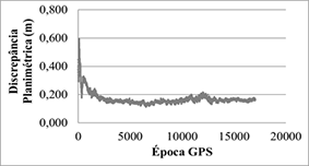 Os desvios padrão para coordenadas planimétricas do PPP encontraram-se no intervalo entre 0,623 e 9,745 metros. Os maiores valores ocorreram da época inicial até a época 1.741, período correspondente aos primeiros 29 minutos de observação, com registro a cada segundo. O método do IBGE-PPP para realizar o ajustamento sequencial e convergir à solução necessita um tempo de aproximadamente 30 minutos, fazendo com que as épocas iniciais, tenham como consequência, desvios padrão mais elevados (Bisbath & Gao, 2008 apudKLEIN et al.,2010). Este fato decorre de que a solução gerada usa a combinação livre dos efeitos ionosféricos de primeira ordem (ionofree) (IBGE, 2013).