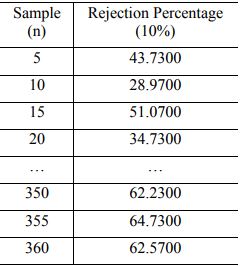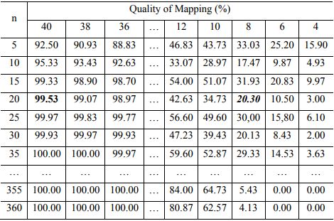After the iterations for the first size of the sample, the software calculates mapping rejection percentage: number of “NOs” divided by the total number, represented by a percentage, as in equation 4.
