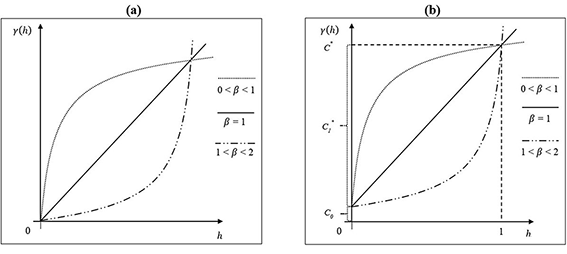 The second possible approach is more general and always applicable because it depends only on the elements of spatial behavior of the phenomenon under study. This approach is based on the assumption that the equivalent sill can be assessed as the value of the estimated semivariance [γ(h)] that coincides with the point at which the adjusted power model curves intersect. Graphically, the justification for this second approach is illustrated in Figure 1(b). On this assumption, the estimated equivalent sill () is equal to the value of γ(h) for which h is equal to 1. That means, = + . From this equality, the relation is defined as: