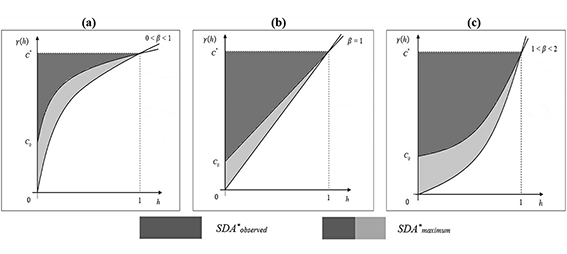 Then, it is observed that the FM* for the power model depends only on the β parameter. Thus, for 0 < β < 1 there is 0 < FM* < 0.500. For β = 1 there is FM* = 0.500. And, for 1 < β < 2 there is 0.500 < FM* < 0.667. This makes the index assume values from 0 to FM* ×100%. For example, in the case of power model with β = 1, the value of SDI* (%) can vary in the range between 0 and 0.500×100%, that is, between 0 and 50%.