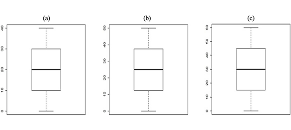 For the construction of the theoretical distribution of SDI* it is considered 101 values of component: sequence from 0 to 1, with variation 0.01. As the power model varies the scale of its distribution depending on the value of β, FM* has different possible values. Thus, for each possible value of β, the 101 generated values are multiplied by FM*×100% to generate the specific distribution of SDI* , corresponding to each possible power model behavior. Figure 4 shows box plots of distributions of the theoretical values for some situations. In Figure 4(a) there is an example of distribution of the SDI* (%) values for FM* = 0.400 (0 < FM* < 0.500; 0 < β < 1). Figure 4(b) shows the distribution of SDI* (%) when FM* = 0.500 (β = 1). And the Figure 4(c) shows the behavior of SDI* (%) for FM* = 0.600 (0.500 < FM* < 0.667; 1 < β < 2).