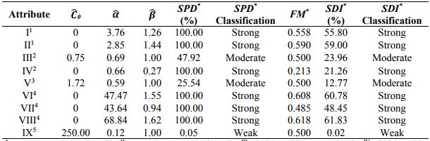 Table 1 shows that it was possible to apply the indexes and their corresponding classifications on real data to show the applicability of the methodology. It was noted strong, moderate and weak spatial dependence classification. It is important to remind users that the two indexes (SPD* and SDI* ) generate the same classification of spatial dependence. However, the SDI* index has the possibility to evaluate the force of spatial dependence because this index considers the factor of model in its expression.