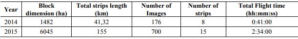 The main interest was to verify the expansion of the invaded area within two years. The datasets were collected in August 2014 and April 2015. In 2014, the images block has eight strips as shown in Figure 2 (left). However in 2015, the images block was expanded to 15 strips (Figure 2, right), due to another study being conducted (environment impacts on this region), which is not part of this paper. Both flights were done at a height of 500m above ground, resulting on a Ground Sample Distance - GSD equal 15 cm. The images forward and side overlaps were approximately 71% and 20% respectively. The Figure 2 also shows the position H (home), where the aircraft was launched in both times. In this position the UAV was manually controlled until reaching a certain altitude and then the command was transferred to the autopilot. The UAV returns to the H position when the mission is completed. Finally, manual operations land the aircraft. Other images blocks characteristics are shown in Table 1. To ensure the best possible sharpness and minimize crabbing effects, the same camera settings were adopted for both years: nominal focal length was 16 mm, shutter speed of 1/1000 and diaphragm aperture (f-stop) 3.5.